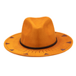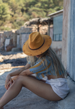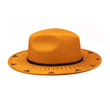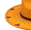 Sombrero indiana hecho a mano en Ibiza en color amarillo mostaza con motivos quemados evocando al sol. Lleva una cinta de fibra natural en color negro.